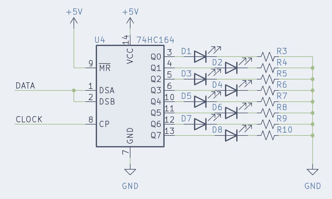 A 74HC164 will be used to save some IO pins. All leds will be managed by this serial to parallel IC except for the 2 leds indicating that filter or UV lamp must be replaced.